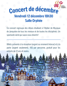 Ce concert regroupe des élèves étudiant à l’Atelier de Musique de Jonquière de tous les niveaux et de toutes les disciplines. Un spectacle varié qui saura vous divertir!